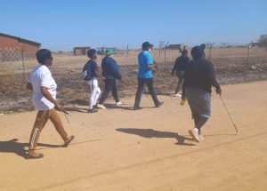 The fun walk by 35 people was led by Irish Muofhe from the South African Mobility for the Blind Trust, based at the Capricorn TVET College in Polokwane where it gives training to students to boost their independence. She gave instruction on how to hold a white cane to ensure safety.