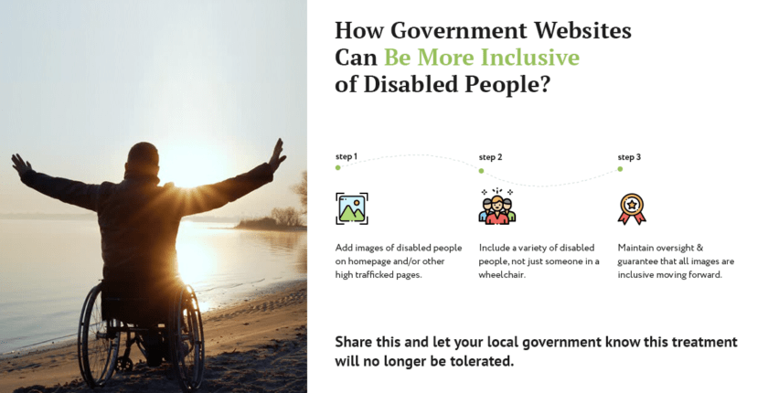 Disabled people are almost non-existent on government and stock-photos websites, and when they are represented, they are not represented as whole individuals, but are only showed for their disability.